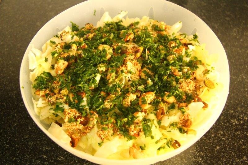 חומרים (4 מנות): 1 ראש כרוב לבן קטן 1 לימון סחוט 1 כפית מלח 1 כפית סוכר ½ כפית פלפל לבן 2 כפות פטרוזיליה קצוצה 2 כפות פיסטוקים קלויים 2 כפות שומשום קלוי 2 כפות שמן