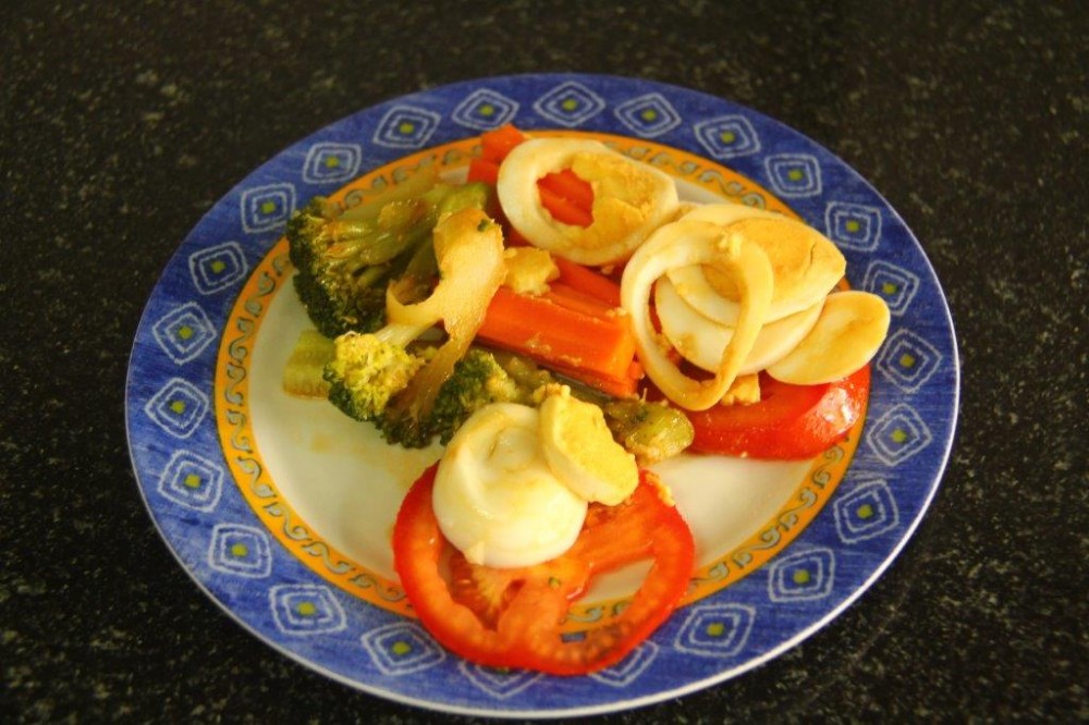 חומרים (6 מנות): 6 ביצים קשות 400 גרם ברוקולי 4 מלפפונים 3 גזרים 2 עגבניות רוטב: 2 כפיות שמן ½ כפית זנגביל טחון 3 כפות שמן